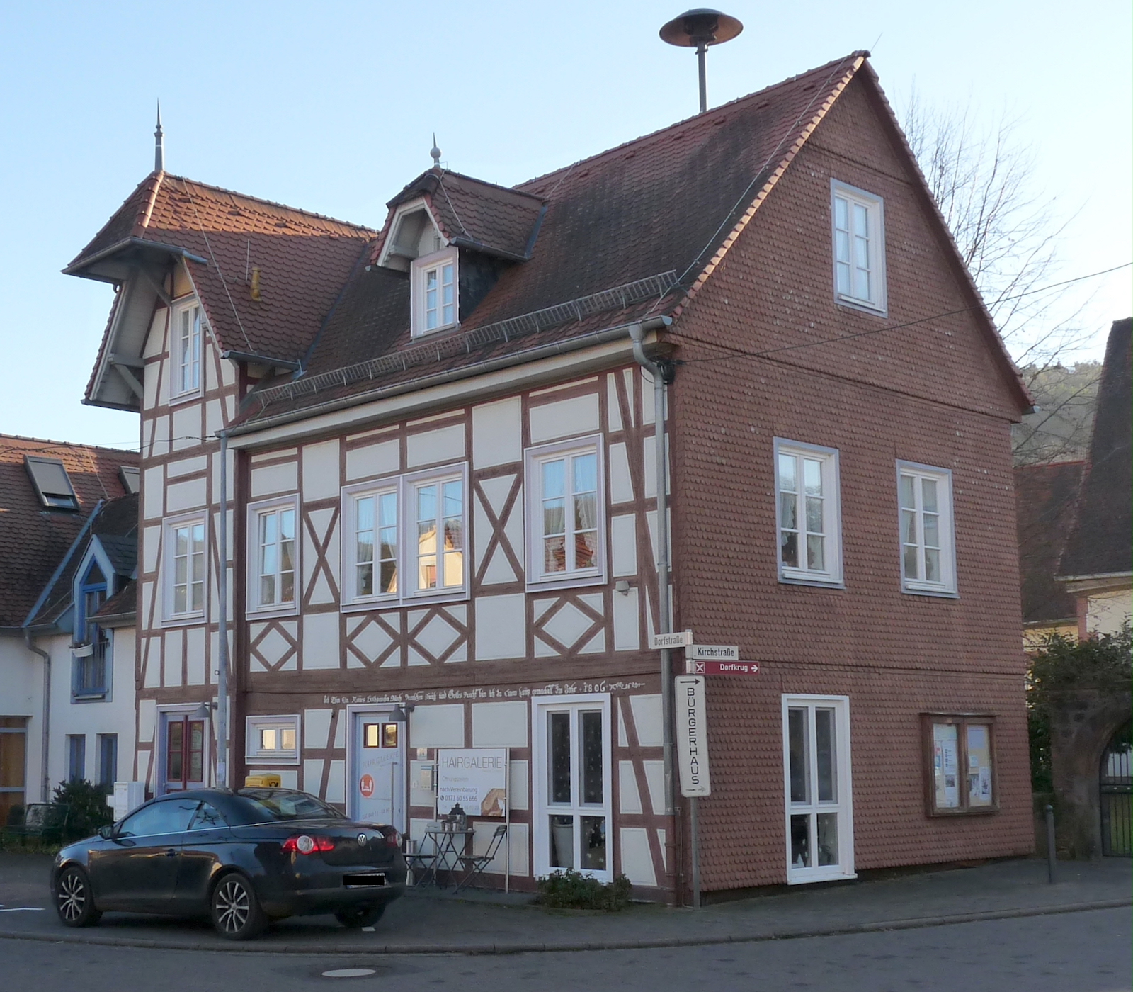 | Zweigeschossiger Fachwerkbau in Ortsmitte mit Erdgeschoss von 1806, Obergeschoss und seitlich giebelständiger Schlauchturm 1889 angebaut. Mehrfach wechselnde Verwendung als Rathaus, Schule, Feuerwehr, Geschäfte. Bild links 2002, Bild rechts 2021. | |