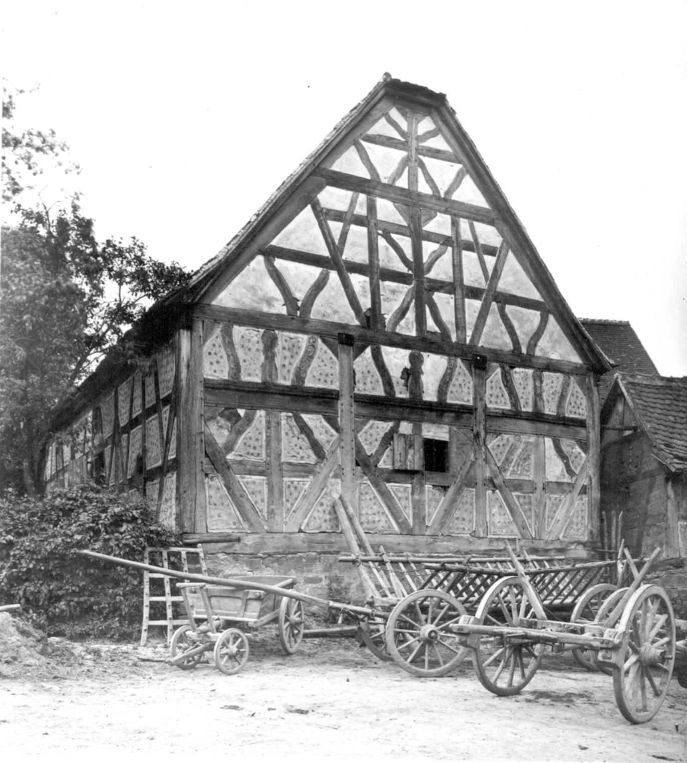 | Große, winkelförmige Hofanlage des 17. und 18. Jahrhunderts in markanter Ecklage. 1923 wurde dem Giebel eine kleine Schlosserwerkstatt vorgebaut. (Foto rechts von 2021) Foto links von 1895, Archiv HuG. | |